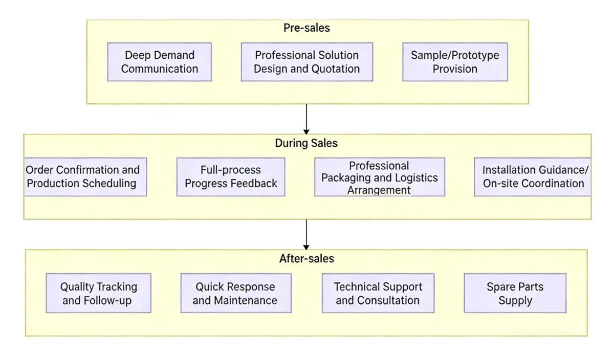 پس از تأیید سفارش، YeHaoXuan یک برنامه تولید اختصاصی را آغاز می کند و به شما امکان می دهد پیشرفت را در زمان واقعی پیگیری کنید. پس از تولید، ما از بسته بندی حرفه ای و لجستیک قابل اعتماد استفاده می کنیم و راهنمایی های نصب و پشتیبانی لازم در محل را برای اطمینان از تحویل روان محصول ارائه می دهیم.